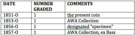 My best guess is that this coin traces its origin from the Baltimore Find; a group of higher grade double eagles dated 1850 through 1856 which were uncovered by two teenagers while excavating an old house in Baltimore ca. 1934-35. From what I know about this hoard, there were some exceptional pieces included and many of the higher grade 1851-O and 1852-O double eagles known are from this source. The new MS63 1851-O has a similar appearance to that seen on other coins likely from the hoard and this leads me to believe that this is where it’s from. It was likely “put away” in the 1930’s and was well-preserved and properly cared-for by its owner(s) until it re-surfaced in 2016.