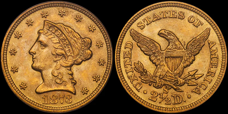 The 1873-S is reasonably well-struck and higher grade coins show excellent frosty luster. The typically seen color is a medium to deep orange-gold, but most have been dipped and are a bright yellow-gold as a result.