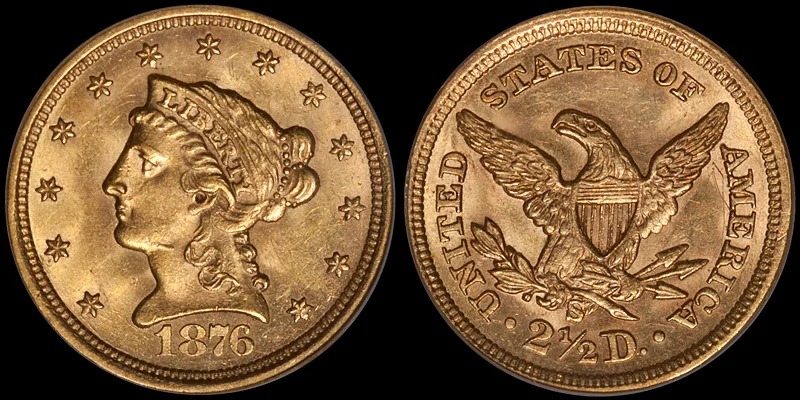 With just 5,000 struck, the 1876-S has the lowest mintage of any collectable San Francisco quarter eagle and the second lowest after the 1854-S. This date is less rare than one might expect as a hoard exists. As many as 15-20 are known in Uncirculated, but nearly all are in the MS61 to MS62 range and this date is very rare in MS63. The single finest piece currently known is a PCGS MS64 which brought $22,800 in 2018.