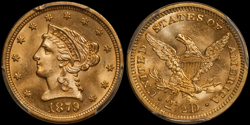 This is the final San Francisco quarter eagle and it is a much scarcer date than generally acknowledged. At one time another dealer and I hoarded 1879-S quarter eagles and we had over 50 (graded AU53 to MS63) before we sold them. This is a scarce and underappreciated date in Uncirculated with fewer than 20 known. The finest is a PCGS/CAC MS64+ which brought $20,001 in 2014. There is also a single PCGS/CAC MS64 which sold twice in 2014.