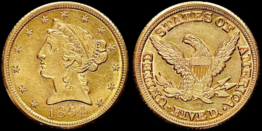1845-D $5.00 PCGS MS65 CAC, courtesy of PCGS